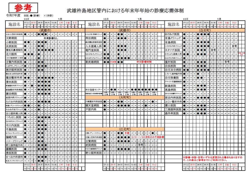 武雄杵島地区内(武雄市・大町町・江北町・白石町)における年末年始の診療体制は下記のようになっております。なお、各医療機関において診療時間等に変更がある場合もございますので、事前にホームページや電話等でご確認のうえご利用いただくようお願いいたします。